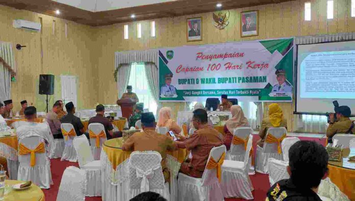Dalam acara resmi yang dihadiri Forkopimda, Sekretaris Daerah Yudesri, Staf Ahli, para Asisten, Kepala OPD, Camat se-Pasaman, Ketua TP PKK, Ketua GOW, Ketua DWP, serta tokoh masyarakat, Bupati Welly Suheri menegaskan bahwa capaian 100 Hari Kerja ini merupakan bentuk laporan pertanggungjawaban moral kepada masyarakat Pasaman.