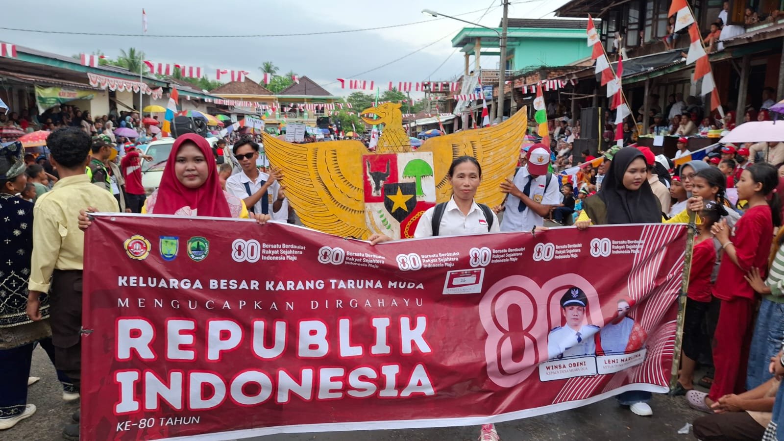Dan Di sambut meria oleh kaum muda mudi karang taruna, serta staf2 desa muara dua, tidak lupa pula masyarakat desa muara dua ikut menghadiri dan memeriahkan perayaan karnaval HUT RI ke-80