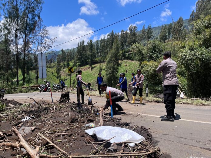 Anggota kepolisian bersama warga sekitar, bahu-membahu membersihkan material longsor agar kendaraan dapat melintas kembali di jalan tersebut.
