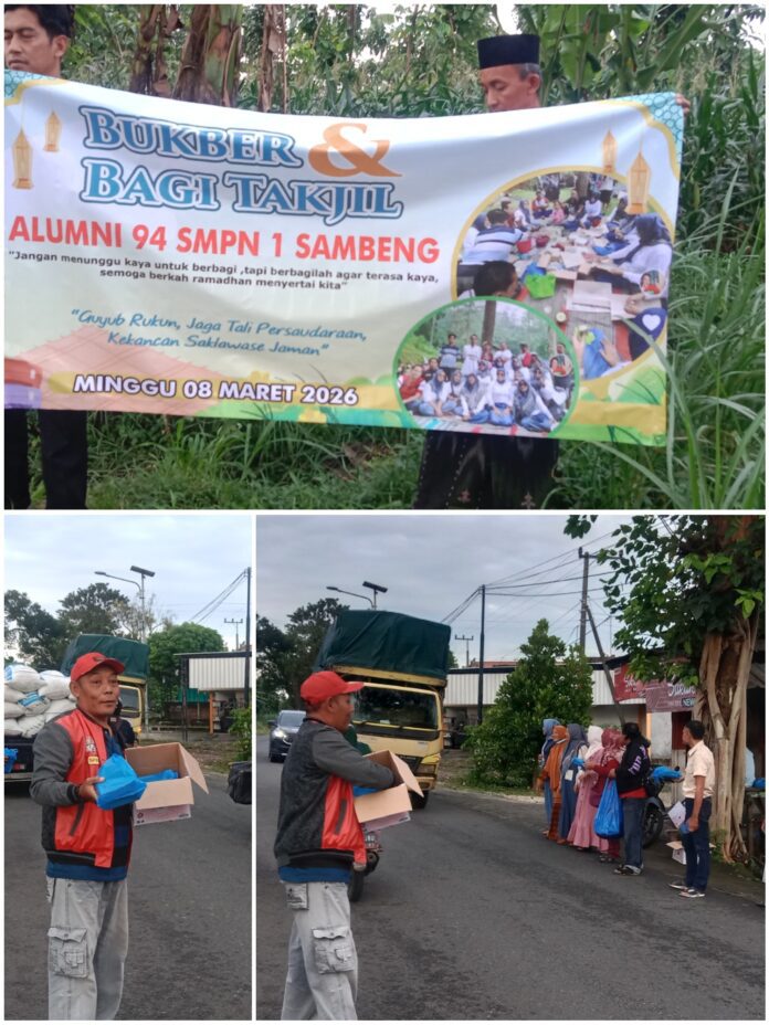 LAMONGAN//Warta.in–Suasana kebersamaan dan kepedulian sosial sebagai moment yang baik di bulan suci Ramadan, Alumni SMP Negeri 1 Sambeng Tahun 1994 menggelar kegiatan sosial berupa pembagian takjil kepada masyarakat dan para pengguna jalan yang melintas di kawasan Jalan Ngimbang – Sambeng Kecamatan Sambeng- Lamongan, pada