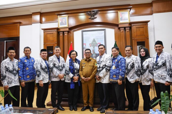 Wartain Banten | Pemerintahan | 17 November 2025 — Gubernur Banten Andra Soni menerima kunjungan pengurus Persatuan Guru Republik Indonesia (PGRI) di Ruang Kerja Gubernur Banten, KP3B Curug, Kota Serang, Senin (17/11/2025). Pertemuan tersebut dimanfaatkan untuk menyampaikan progres dan dampak positif Program Sekolah Gratis yang saat ini dijalankan Pemerintah Provinsi (Pemprov) Banten.