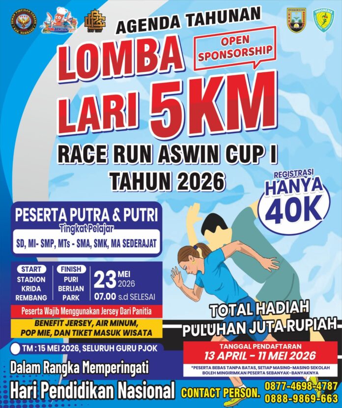 Rembang// Warta.in// Dalam rangka menyemarakkan perayaan Hari Pendidikan Nasional Asosiasi Wartawan Internasional (ASWIN) Kabupaten Rembang akan menggelar ajang lomba lari pelajar bertajuk Race Run ASWIN Cup I, 5K pada Sabtu, 23 Mei 2026. ASWIN Cup I, 5K berkolaborasi dengan tempat wisata Puri Berlian Park, PASI Rembang dan Disdikpora Kabupaten Rembang ini merupakan lomba lari race run khusus pelajar pertama di Rembang, yang bisa diikuti pelajar dari jenjang SD, SMP, hingga SMA sederajat dari seluruh Kabupaten Rembang.