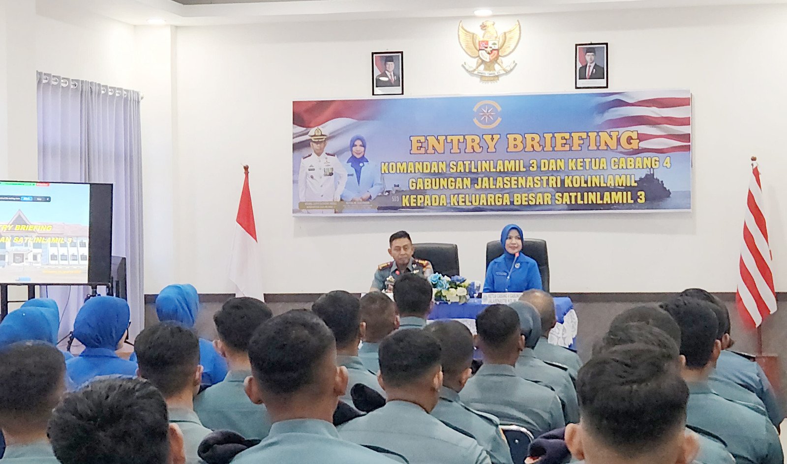 TNI AL, Makassar | warta.in – Awali penugasan sebagai Komandan Satlinlamil 3, Kolonel Laut (P) Sulthon Maula Firdaus, M.Tr.Opsla., didampingi Ketua Cabang 4 Gabungan Jalasenastri Kolinlamil Ny. Alin Sulthon melaksanakan Entry Briefing kepada Keluarga Besar Satlinlamil 3, bertempat di Ruang Rapat Mako Satlinlamil 3, Jalan Teuku Umar, Kota Makassar, Selasa (12/8/2025).