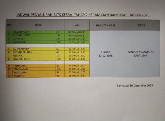 KARAWANG – Pembagian Bantuan Langsung Tunai Sosial (BLTS) Kesra tahap II tahun 2025 yang dilaksanakan di Aula Kantor Kecamatan Banyusari, Selasa (30/12/2025), menuai sorotan publik. Kegiatan penyaluran bantuan oleh PT Kantor Pos kepada 1.318 penerima manfaat dari 12 desa tersebut dinilai mengganggu pelayanan administrasi pemerintahan karena dilakukan pada hari dan jam kerja aktif.