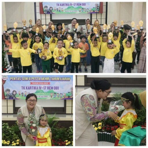 “Saya merasa sangat bangga dan bahagia melihat perkembangan anak-anak kita yang luar biasa. Mereka adalah anak-anak hebat yang telah melewati proses belajar dengan semangat, keceriaan, dan rasa ingin tahu yang tinggi,” kata Frieda dalam sambutannya yang dibacakan Sekretaris Yayasan Kartika Jaya Koordinator Korem 081 Ny. Susiana pada acara Pentas Seni dan Perpisahan TK Kartika IV-17 di Aula Jenderal Sudirman Makorem 081/DSJ, Jl. Pahlawan No. 50 Kota Madiun, Rabu (18/6/2025).