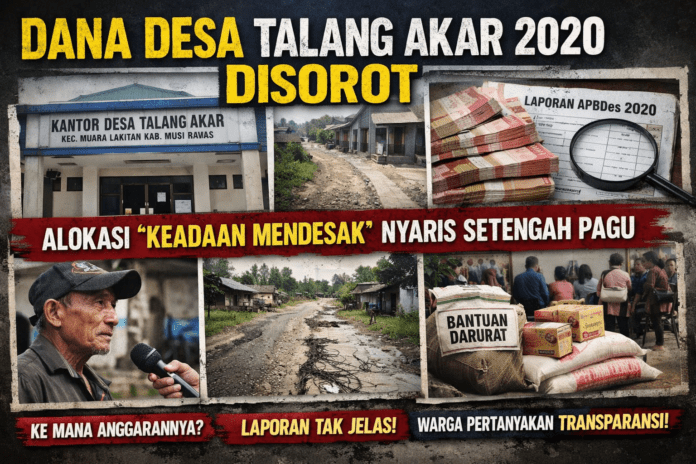 Talang Akar, KC Talang Ubi — diduga Penggunaan Dana Desa Tahun Anggaran 2020 di Desa Talang Akar menjadi sorotan. Berdasarkan data yang dihimpun, total pagu Dana Desa mencapai Rp1.016.057.000. Dari jumlah tersebut, alokasi terbesar justru terserap pada pos keadaan mendesak sebesar Rp453.600.000, disusul anggaran penanggulangan bencana Rp50.000.000.