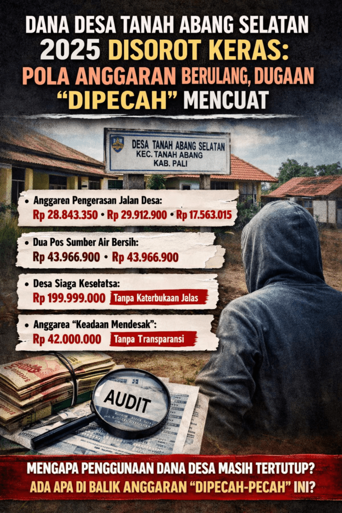 PALI — Pengelolaan Dana Desa Tahun Anggaran 2025 di Desa Tanah Abang Selatan mulai menuai sorotan. Dengan total pagu mencapai Rp 968.612.000, sejumlah pos anggaran terindikasi janggal dan memunculkan tanda tanya serius terkait transparansi serta akuntabilitas penggunaan dana.