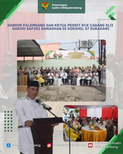 Warta.In | Palembang, — Komandan Kodim (Dandim) 0418/Palembang Letkol Arh Erik Novianto, S.Sos bersama Ketua Persit Kartika Chandra Kirana (KCK) Cabang XLII Ny.Hayu Erik Novianto menghadiri kegiatan Safari Ramadhan yang digelar di Koramil 418-07/Sukarami, Palembang.