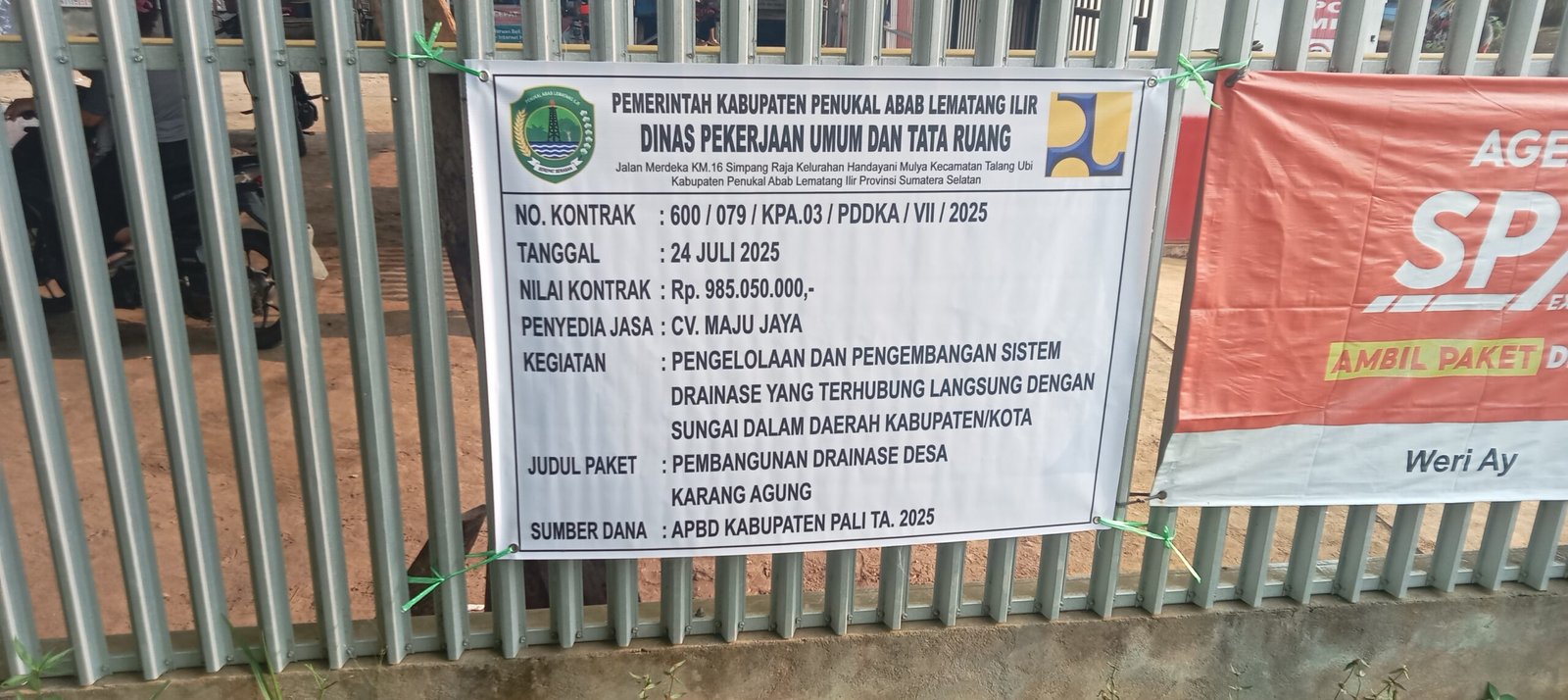 PALI- diduga Pembangunan Drenase desa karang agung, kecamatan abab, Kabupaten Penukal Abab Lematang Ilir(PALI) Provinsi Sumatra Selatan(Sumsel) Selasa 12/08/25 Mulai Mendapat Sorotan Tajam dari Kalangan Masyarakat dan Awak Media.
