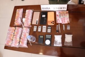 “Kini ke 4 (empat) terduga pelaku beserta barang bukti berupa 2 (dua) sachet diduga berisi narkotika jenis sabu, 6 (enam) buah timbangan elektronik, 1 (satu) set alat isap (bong), 3 (tiga) buah handphone, 5 (lima) ball sachet plastic klip bening, 4 (empat) potongan pipet, 1 (satu) buah korek dan uang tunai Rp. 400.000 telah diamankan di Polres Tana Toraja guna proses penyidikan,” beber Kapolres.