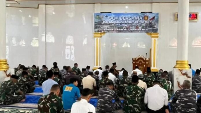 TNI AL, Bengkulu | warta.in – Dalam rangka memperingati Hari Ulang Tahun (HUT) Ke-80 Tentara Nasional Indonesia (TNI) Tahun 2025, Unsur TNI Provinsi Bengkulu menyelenggarakan acara Doa Bersama dengan tema “TNI Prima – TNI Rakyat – Indonesia Maju” yang beragama Islam bertempat di Masjid Al-Mubarok Mako Lanal Bengkulu dan yang beragama Kristen di Balai Sudirman Makorem 041/Gamas Bengkulu, Sabtu (04/10/2025).