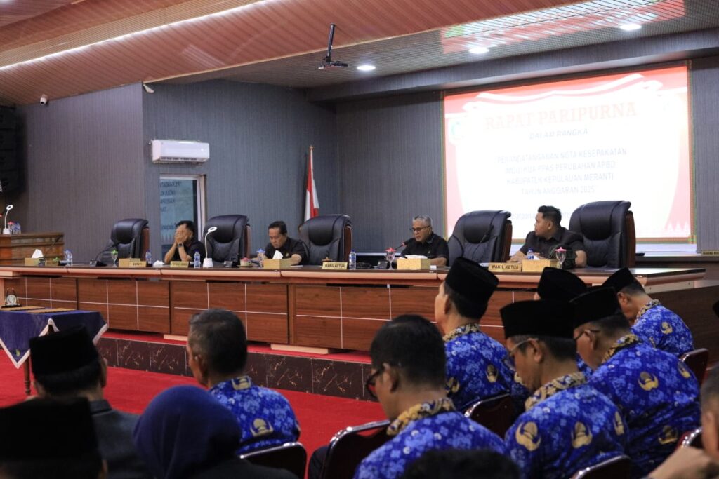 Kepulauan Meranti – Di ruang rapat paripurna yang dipenuhi suasana khidmat, palu sidang akhirnya diketuk. Rabu (17/9/2025), DPRD Kabupaten Kepulauan Meranti resmi menandatangani Nota Kesepakatan (MoU) Kebijakan Umum Anggaran dan Plafon Prioritas Anggaran Sementara (KUA-PPAS) Perubahan APBD Tahun 2025.