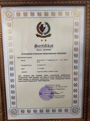 Warta.in Jakarta Pusat – Kapolres Metro Jakarta Pusat Kombes Pol Dr Reynold E.P Hutagalung menerima penganugerahan penyematan Brevet Kehormatan “Setia Waspada” dari Pasukan Pengamanan Presiden (Paspampres). Kegiatan berlangsung di Ruang Bhuana Agung, Mako Paspampres, Rabu (11/2/2026) pukul 09.00 WIB.