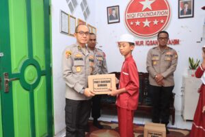 Bantuan diserahkan kepada pengasuh yayasan Nur Iqsan Ibrahim Bpk. Ustadz Adi Paryanto dan secara simbolis diserahkan langsung Bpk. Kapolres Metro Bekasi Kota kepada anak-anak Yatim Piatu, Adapun bantuan 50 dus paket sembako.