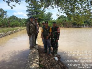 Subang, Blanakan | Warta In Jabar — Tanggul Sungai Cibeuying yang melintasi Desa Jayamukti, Kecamatan Blanakan, Kabupaten Subang, jebol di sisi kiri sepanjang kurang lebih lima meter. Akibat kejadian tersebut, air sungai meluber ke jalan dan area persawahan warga. Kondisi ini berpotensi memperluas genangan apabila tidak segera ditangani.