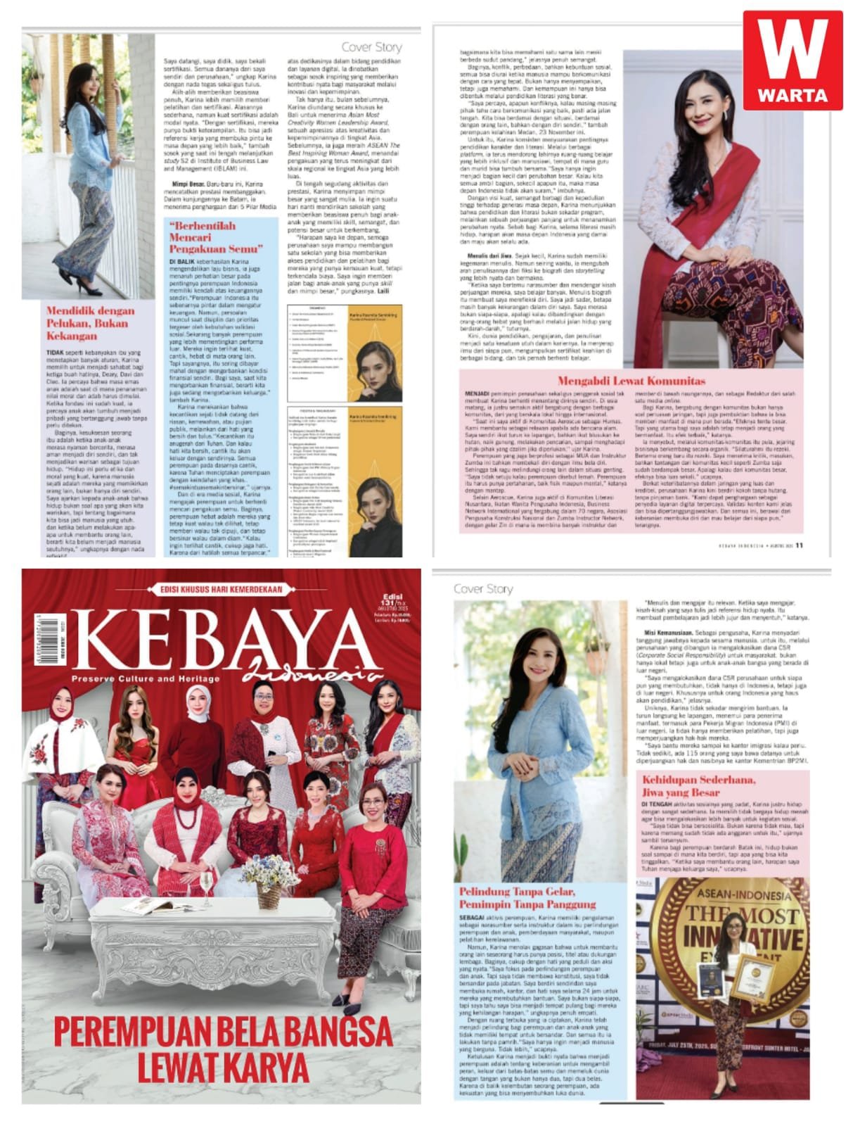 Batam – Warta.in – Menyambut peringatan Hari Kemerdekaan Republik Indonesia ke-80 pada 17 Agustus 2025, Majalah Kebaya Indonesia merilis edisi spesial bertema “Perempuan Bela Bangsa Lewat Karya”. Dalam edisi istimewa ini, sosok Karina Sembiring tampil di halaman sampul bersama dua tokoh nasional, Menteri Pemberdayaan Perempuan dan Perlindungan Anak Arifatul Choiri Fauzi, serta tokoh perempuan senior Bunda Dewi Motik.