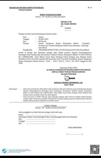 Dugaan penyalahgunaan dan penyelewengan Anggaran Pendapatan dan Belanja Desa (APBDes) Tahap I Tahun Anggaran 2024 di Desa SumberJaya, Kecamatan Tambun Selatan, yang kini sedang ditangani oleh Kejaksaan Negeri (Kejari) Cikarang,tengah menjadi perhatian masyarakat. Publik mendesak adanya kejelasan perkembangan kasus tersebut agar tidak berakhir sebagai wacana semata.
