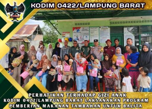warta.in,,Lampung Barat, Kamis, 10 Juli 2025 — Dalam upaya meningkatkan status gizi anak usia dini dan mencegah risiko stunting, Kodim 0422/Lampung Barat melaksanakan kegiatan Pemberian Makanan Tambahan (PMT) kepada balita di wilayah binaannya.
