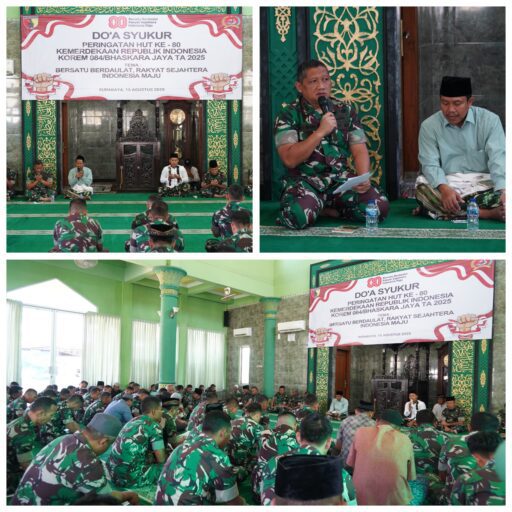 Warta In | Surabaya – Dalam rangka memperingati Hari Ulang Tahun ke-80 Kemerdekaan Republik Indonesia, Korem 084/Bhaskara Jaya menggelar doa syukur di Masjid Al Wathon, Makorem 084/BJ, Jumat (15/8/2025). Kegiatan ini dihadiri oleh Kasrem 084/BJ, para Kasi, para Pasi, seluruh prajurit TNI, dan PNS Korem 084/BJ.