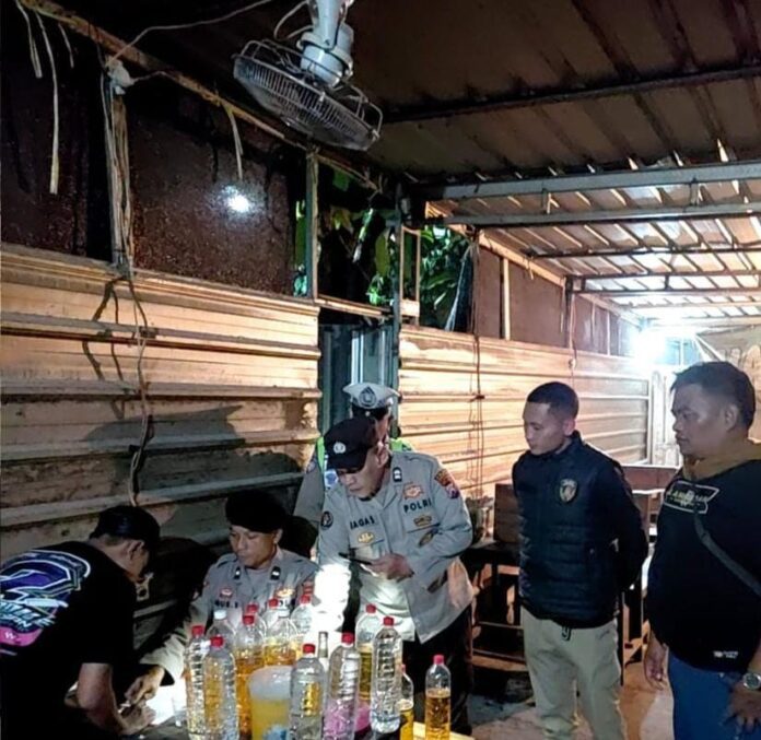 Setibanya di lokasi, petugas melakukan pemeriksaan serta mengamankan sejumlah barang bukti minuman keras untuk proses lebih lanjut.