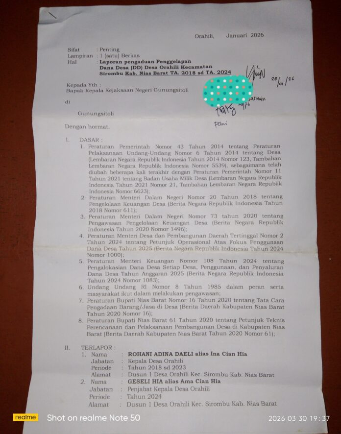 Viralnya dugaan korupsi Dana Desa orahili kec.sirombu kabupaten Nias barat TA.2018-2024 duga mangkrak laporan tersebut di kejari Gunungsitoli sumatera utara