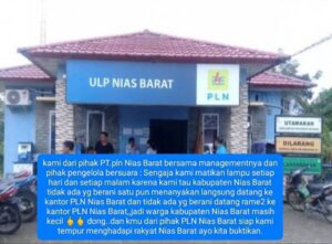 Lanjut S.H mengatakan apa bila dalam waktu dekat tidak bisa di atasi pemadaman listrik negara di wilayah nias barat ini oleh maneger PT.PLN persero tbk.ULP nias barat barat akan turun demo di kantor ULP nias barat karena mengingat dan menimbang Bulan dua belas dan bulan januari 2026 itu masyarakat sangat butuh penerangan listrik kerena kita menyambut hari kebahagian Seluruh dunia.