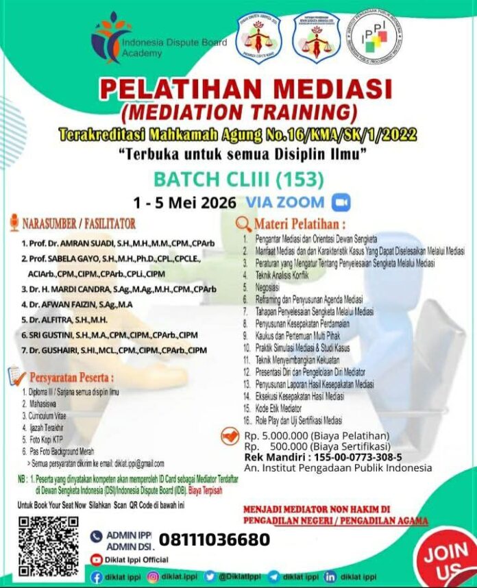 JAKARTA – Dalam upaya memperkuat sistem penyelesaian sengketa di Indonesia melalui mekanisme alternatif di luar pengadilan, Institut Pengadaan Publik Indonesia (IPPI) kembali membuka kesempatan emas bagi para profesional, praktisi hukum, dan masyarakat luas untuk mengikuti Pelatihan Mediasi Batch ke-CLIII (153). Kegiatan pendidikan dan pelatihan ini merupakan wujud komitmen nyata dalam mencetak mediator yang handal, berintegritas, dan memiliki kompetensi yang diakui secara hukum.