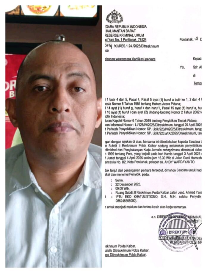 Pontianak, WARTA IN Kalbar — Apriansyah menyatakan keberatan serius dan merasa dirugikan secara moral setelah menerima undangan wawancara klarifikasi dari Kepolisian Daerah Kalimantan Barat (Polda Kalbar) terkait dugaan tindak pidana intimidasi dan penghalangan kerja jurnalistik sebagaimana diatur dalam Undang-Undang Nomor 40 Tahun 1999 tentang Pers.