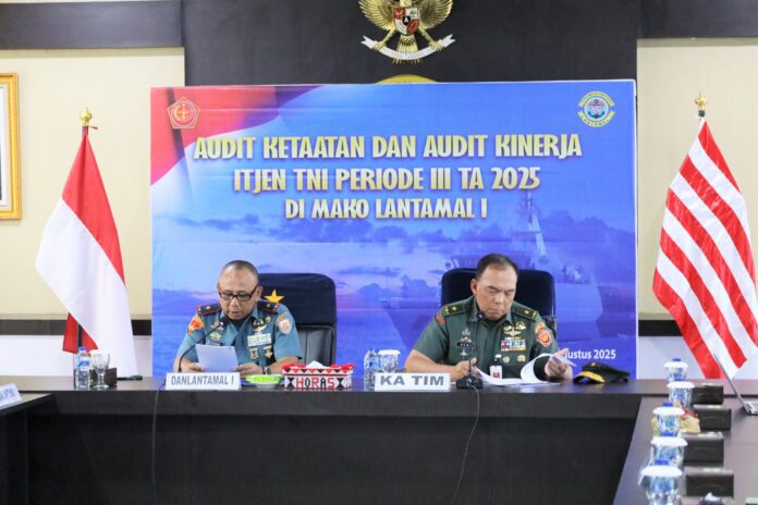 TNI AL, Belawan | warta.in – Komandan Pangkalan Utama TNI Angkatan Laut I (Danlantamal I) Brigjen TNI (Mar) Jasiman Purba, S.E., CHRMP., menghadiri acara Audit Kinerja dan Audit Ketaatan Itjen TNI Periode III Tahun 2025, bertempat di Gedung R.Mulyadi Mako Lantamal I, Jalan Serma Hanafiah No.01 Belawan, Sumatera Utara, Senin (4/8/2025).