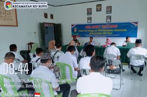 Rapat tersebut dihadiri oleh Kepala Puskesmas yang diwakili oleh KTU dan ahli gizi, Koramil Kota Mukomuko, Polsek Kota Mukomuko, dan jajaran kepala desa di wilayah Kecamatan XIV Koto. Kehadiran dan partisipasi semua pihak merupakan komitmen bersama dalam menurunkan angka stunting dan mewujudkan Indonesia Emas 2045.