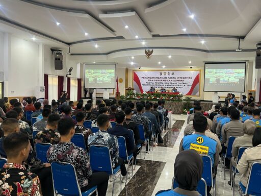 Mataram,NTB – Polda NTB menegaskan komitmennya, untuk menyelenggarakan seleksi penerimaan anggota Polri yang bersih, transparan, akuntabel, dan humanis (BETAH). Hal itu ditegaskan dalam acara Penandatanganan Pakta Integritas dan Pengambilan Sumpah Panitia, Peserta, serta Orang Tua/Wali Penerimaan Terpadu Anggota Polri, Jumat (7/3/2025), di Gedung Sasana Dharma Polda NTB.