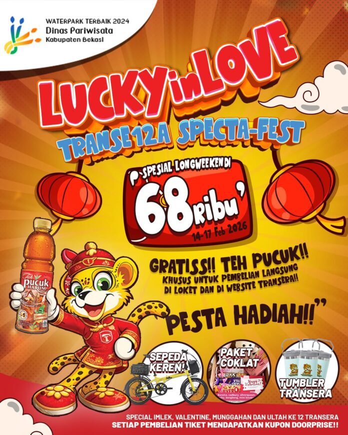 Bekasi – Mulai 14 hingga 17 Februari 2026, Transera Waterpark Harapan Indah, menghadirkan Triple Happiness Specta-Fest, perayaan kolosal yang memadukan kemeriahan Imlek, kehangatan Valentine, serta momen spesial ulang tahun ke-12 Transera.