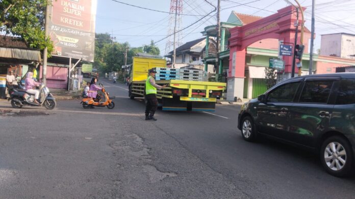 Terlihat kesibukan Anggota Petugas Polsek Ngimbang Aiptu Djudi dan Brigadir Deny untuk melaksanakan pengaturan lalu lintas cegah lakalantas dipagi hari