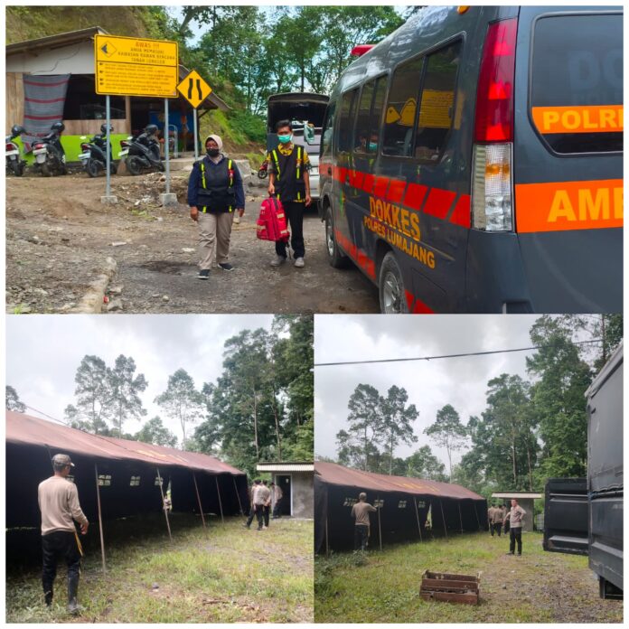 LUMAJANG,Warta In — Polres Lumajang Polda Jatim mendirikan tenda darurat dan Pos Tanggap Bencana di jalur Piket Nol, Desa Supit Urang, Kecamatan Pronojiwo, Kabupaten Lumajang.