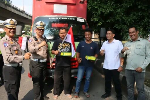 Polrestabes Semarang Bagikan Bendera Merah Putih Untuk Pengemudi Truck di Jalan Arteri Yos Sudarso