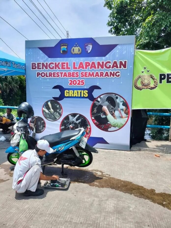 Semarang – Sebagai bentuk kepedulian terhadap masyarakat terdampak banjir, Polrestabes Semarang mendirikan bengkel lapangan di kawasan Jalan Raya Kaligawe, Kecamatan Genuk, Jumat (31/10/2025).