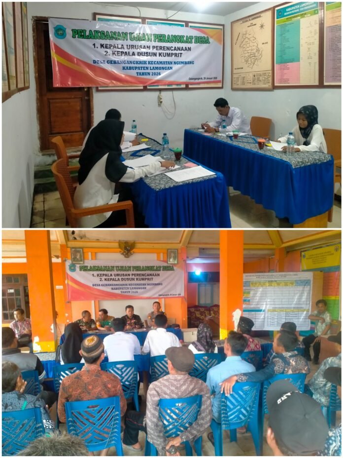 Bertempat di Balai Desa Gebangangkrik, Kecamatan Ngimbang, Kabupaten Lamongan, pelaksanaan Ujian perangkat Desa Gebangangkrik guna mengisi jabatan Kepala Dusun Kumprit dan Kaur Perencanaan Desa Gebangangkrik