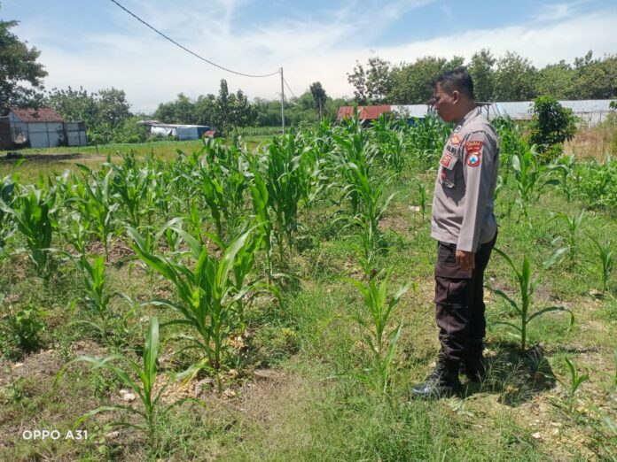 Personil Polsek Ngimbang turun langsung ke lahan baku sawah (LBS) milik warga di Desa Cerme Kecamatan Ngimbang, Kabupaten Lamongan, untuk melakukan pengecekan kondisi tanaman jagung sebagai bagian dari dukungan terhadap program swasembada pangan nasional.