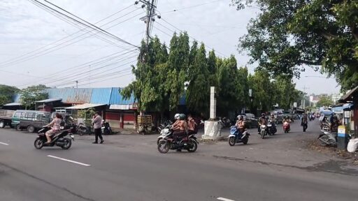 Terlihat kesibukan Anggota Petugas Polsek Ngimbang Aiptu Muji dan Aipda Erwan untuk melaksanakan pengaturan lalu lintas cegah lakalantas dipagi hari di daerah rawan kemacetan