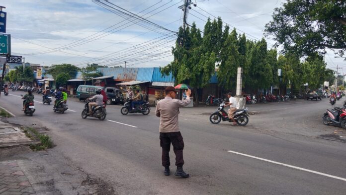 Terlihat kesibukan Anggota Petugas Polsek Ngimbang Aiptu Muji dan Aipda Erwan untuk melaksanakan pengaturan lalu lintas cegah lakalantas dipagi hari di daerah rawan kemacetan