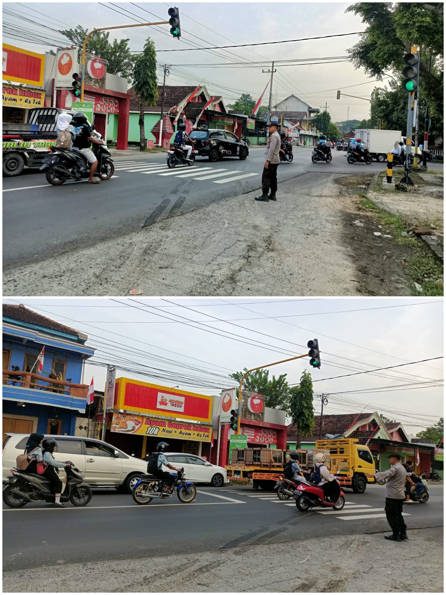 Terlihat kesibukan Anggota Petugas Polsek Ngimbang Aiptu Muji dan Bripda Andika melaksanakan pengaturan lalu lintas cegah lakalantas dipagi hari