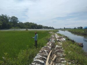 Ket foto : Ketua Poktan langgeng 1 Bapak Suwono, menunjukkan lahan yang dulunya tergenang kini bisa ditanami kembali setelah laksanakan program Oplah.