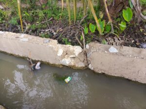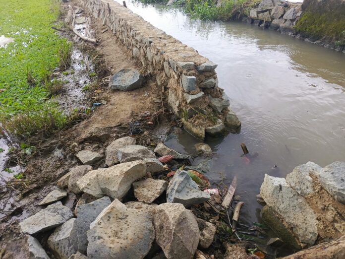 Di lapangan, terlihat batu belah dipasang langsung di dalam lumpur dan genangan air, tanpa adanya upaya pengeringan area kerja atau pembuatan bendungan sementara. Padahal, secara teknis, pemasangan turap seharusnya dilakukan pada dasar yang kering dan stabil agar konstruksi kuat dan tahan lama.