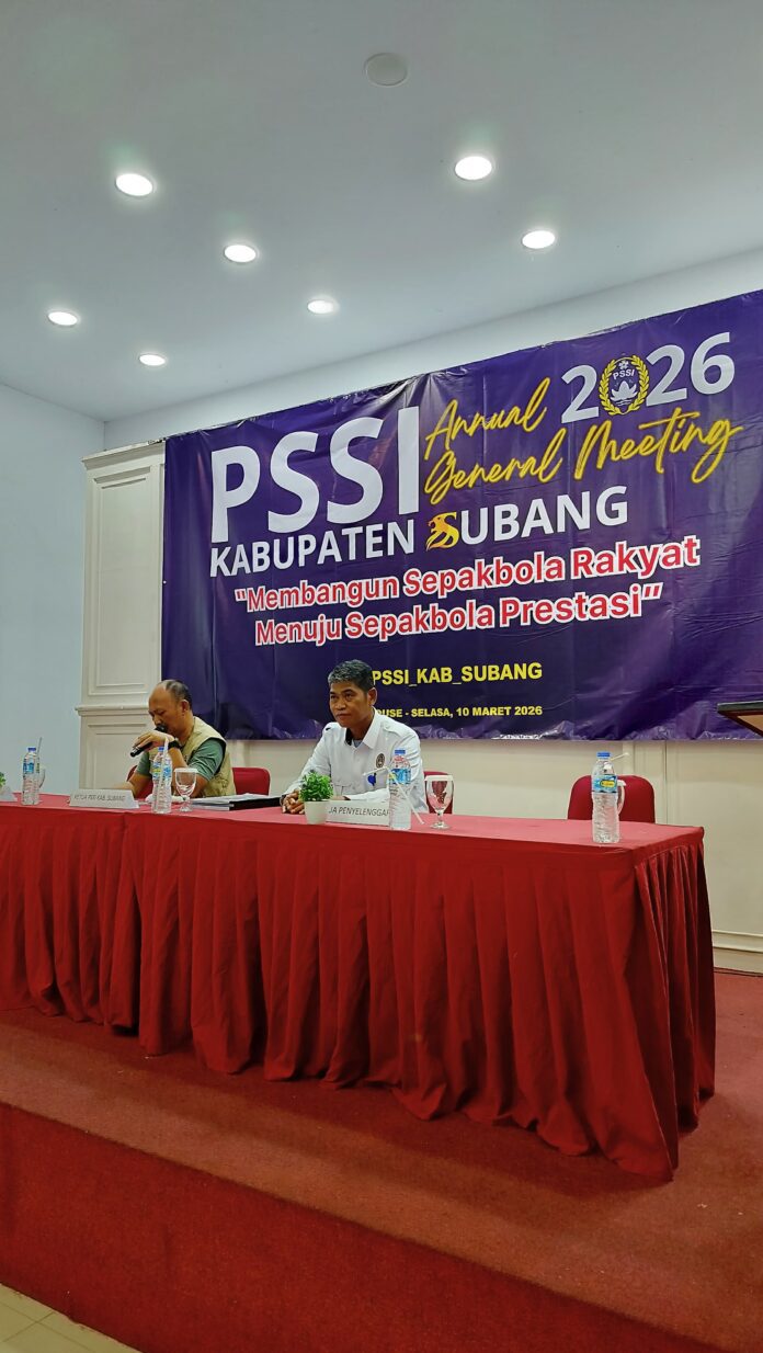 Warta In, subang, Persatuan Sepak Bola Seluruh Indonesia (PSSI) Kabupaten Subang mengadakan Annual General Meeting (AGM) 2026 dengan tema “Membangun Sepak Bola Rakyat menuju Sepak Bola Prestasi”. Agenda ini bertujuan untuk mengevaluasi kinerja dan merumuskan strategi untuk meningkatkan prestasi sepak bola di Subang, kegiatan tersebut berlangsung di Grant House, selasa (10/03/2026).