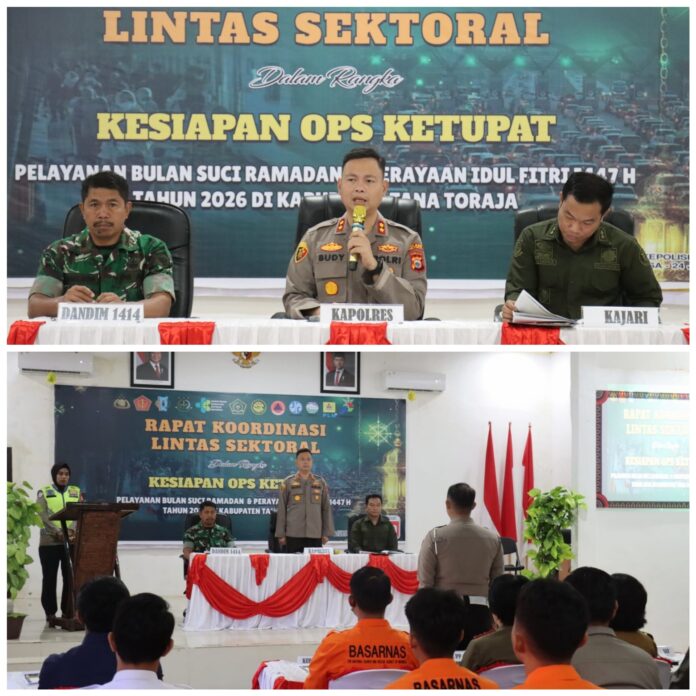 TANA TORAJA – Persiapkan Operasi Ketupat 2026 untuk kesiapan pengamanan Idul fitri 1447 H di wilayah Kabupaten Tana Toraja, Kepolisian Resor (Polres) Tana Toraja menggelar Rapat Koordinasi (Rakor) Lintas Sektoral, Selasa (10/3/2016).