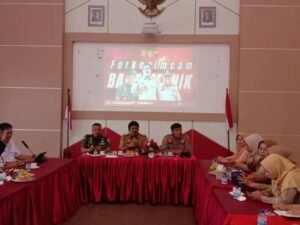 Kota Semarang – Forum Komunikasi Pimpinan Kecamatan (Forkopimcam) Banyumanik menggelar rapat koordinasi di Aula Kantor Kecamatan Banyumanik, Senin (3/11/2025) siang. Kegiatan yang diikuti sekitar 30 peserta tersebut dihadiri oleh Plt Camat Banyumanik Cipta Nugraha, S.Sos., M.A.P., Kapolsek Banyumanik Kompol Hengky Prasetyo, S.H., M.H., Danramil 05 Banyumanik Mayor Arn Abdilah, S.Pd.I., Kepala Puskesmas Banyumanik, para lurah se-Kecamatan Banyumanik, serta perwakilan SPPG (Sentra Pemenuhan Pangan Gizi).