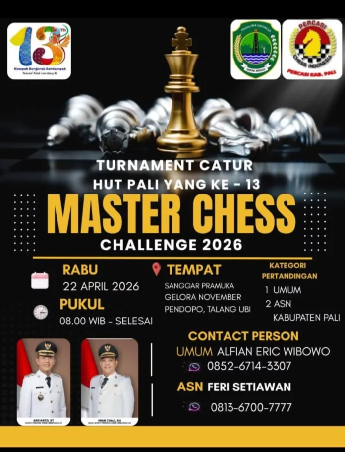 Sumatera Selatan, PALI, 13 April 2026 – Dalam rangka memperingati Hari Ulang Tahun (HUT) ke-13 Kabupaten Penukal Abab Lematang Ilir (PALI), Pemerintah Kabupaten PALI bekerja sama dengan Pengurus Kabupaten (Pengkab) Percasi PALI resmi menggelar ajang bergengsi bertajuk “Turnamen Master Catur HUT PALI ke-13”.