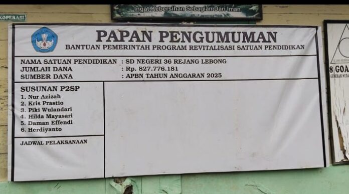 Proses Pekerjaan Program Revitalisasi Satuan Pendidikan Direktorat jendral Pendidikan Anak Usia Dini, Pendidikan Dasar Menengah, Kementrian Pendidikan Dasar dan Menengah, satuan Pendidikan Sekolah Dasar 36 Rejang Lebong, menggunakan anggaran sebesar Rp 827.776.181,- tahun 2025, menuai sorotan masyarakat sekitar, karena Proses Pekerjaan terindikasi terdapat kecurangan dan asal jadi