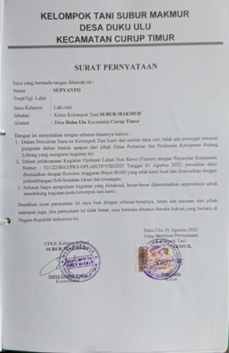 Kelompok Tani Subur Makmur Desa Duku Ulu , Supyanto menjelaskan, ” Iya Pak surat tersebut kami yang berikan kepada Dinas Pertanian, murni dari kami pak, yang tanda tangan saya ketua kelompok tani perwakilan pengurus kelompok saya yang lainnya, tujuan kami buat surat itu menjelaskan bahwa tidak ada pungutan fee dalam bentuk apapun dari Dinas Pertanian. Jadi keterangan saya ini bukan membela tapi benar yang dikatakan pak PPK dari Dinas Pertanian itu, kalau mau lihat biar saya perlihatkan arsip saya , itupun kami buat sebelum direalisasikan atau dikerjakan anggaran oplah ini pak, ” Jelas Sopyan. (A)