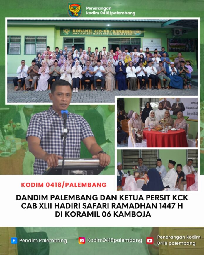 WARTA.IN | PALEMBANG, – Komandan Kodim 0418/Palembang, Letkol Arh Erik Novianto,S.Sos.,dan Ketua Persit KCK Cabang XLII Ny,Hayu Erik Novianto melaksanakan kegiatan Safari Ramadan 1447 H Tahun 2026 bersama di Makoramil 418-06/Kamboja, Jalan Mayor Santoso RT 24 RW 09, Kelurahan 20 Ilir D-3, Kecamatan Ilir Timur I, Kota Palembang, Senin (2/3/2026).